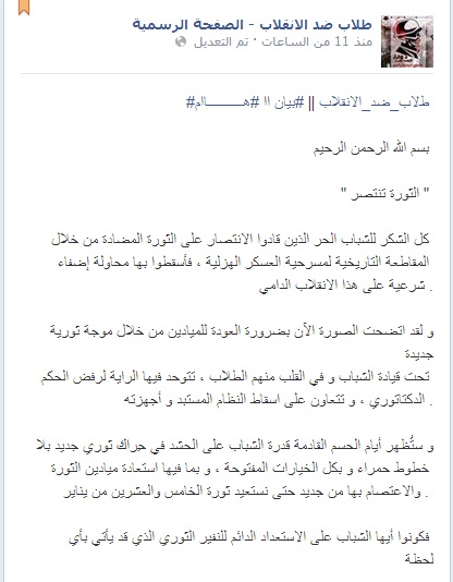 وقالت الحركة في بيان علي صفحتها الرسمية بموقع التواصل الاجتماعي، "الفيس بوك" : "لقد اتضحت الصورة الآن بضرورة العودة للميادين من خلال موجة ثورية جديدة، تحت قيادة الشباب و في القلب منهم الطلاب ، تتوحد فيها الراية لرفض الحكم  الدكتاتوري ، و تتعاون على إسقاط النظام المستبد و أجهزته" .