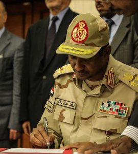 تعهد نائب رئيس المجلس العسكري الانتقالي فى السودان محمد حمدان دقلو، الشهير بـ «حميدتي»، أن يلتزم المجلس العسكري بكل حرف في اتفاق تقاسم السلطة المبرم مع المعارضة.