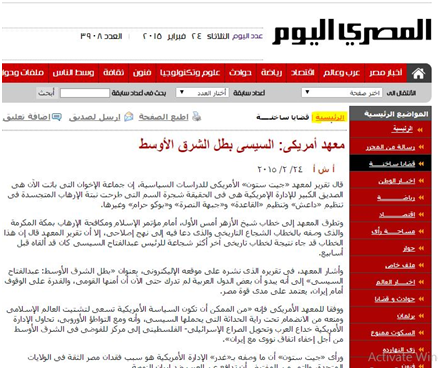 ويقابل تشويه المعهد اليميني للإسلام عبر الادعاءات الكاذبة، كيل المركز للثناء على السيسي وسياسته واعتباره المنقذ والمخلص، فيما يقوم الإعلام المصري بدوره بتسليط الضوء على إنتاج المركز ومقالاته، التي يصدرها لإيهام القارئ بأن الرأي العام العالمي وقادة الفكر في الغرب مؤيدون للسيسي، وبمجرد البحث داخل الموقع بكلمة “سيسي” تجد ما يقرب من 400 موضوع جميعها تأييد له ولسياساته، فبتاريخ 14-2-2015 نشر المركز مقالًا بعنوان “عبدالفتاح السيسي بطل الشرق الأوسط” وهو ما احتفت به الصحف المؤيدة لنظام الثالث من يوليو، لدرجة أن بعضها وضع الخبر في صدر صفحتها الأولى، مثل “اليوم السابع”، و”المصري اليوم”، و”روزاليوسف”، و”الوطن”.