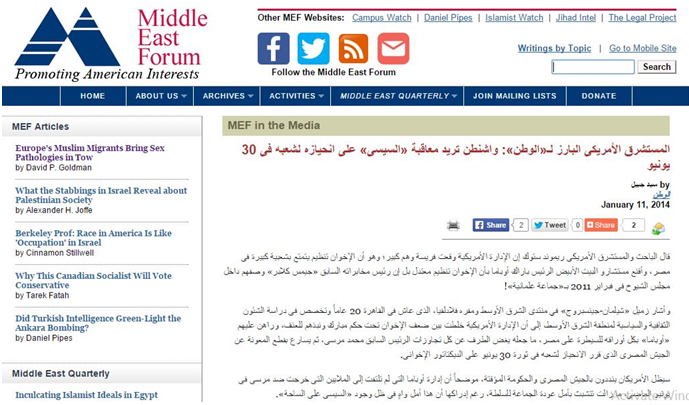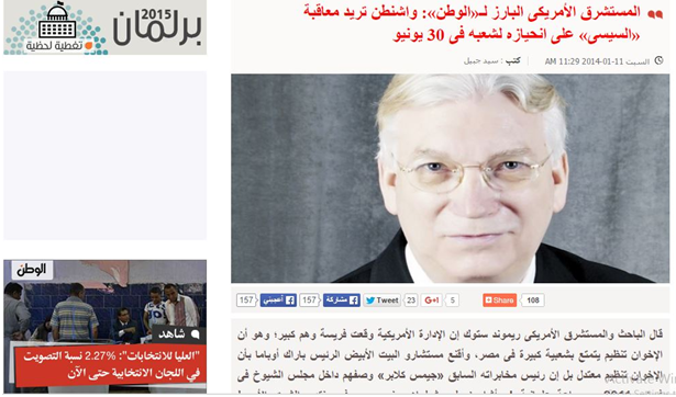 ولم تكتف صحيفة “الوطن” بنشر ما قاله المستشرق ريموند ستوك، أحد أبرز الباحثين في المركز اليميني “جيت ستون انستتيوت”، بل أجرت حوارًا معه نشره المركز باللغة العربية على موقعه بشبكة الإنترنت.